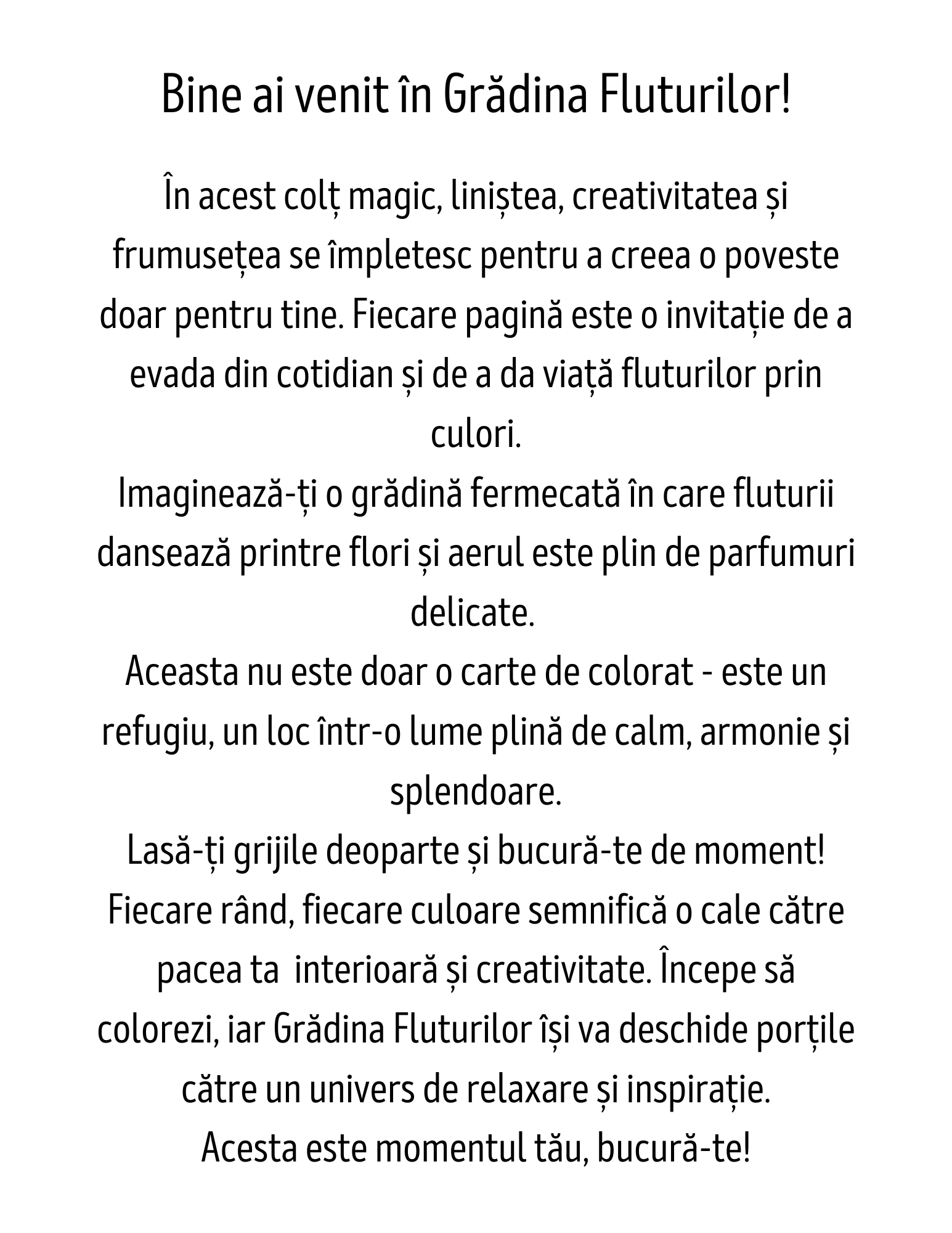 Nu mai astepta! Adauga „Fluturi de gradina: transforma stresul in arta” in cosul tau acum si incepe-ti calatoria catre relaxare si inspiratie. Este timpul sa-ti creezi gradina linistita – o pagina, o culoare, un moment la un moment dat!