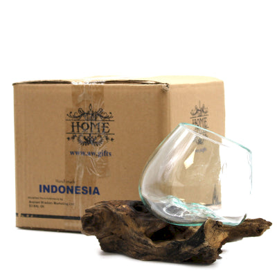Fabricată manual în Bali, din sticlă reciclată și lemn balinez Gamal această Sticla Topita pe Lemn - Bol Mediu reunește cele mai bune elemente dintre două lumi: naturală și artificială; pământesc și spiritual.